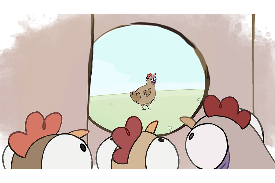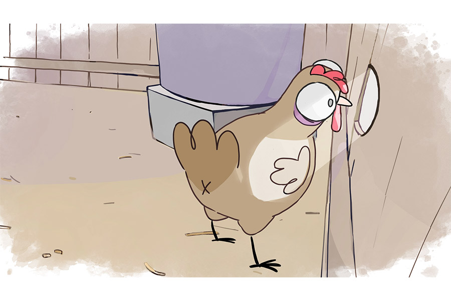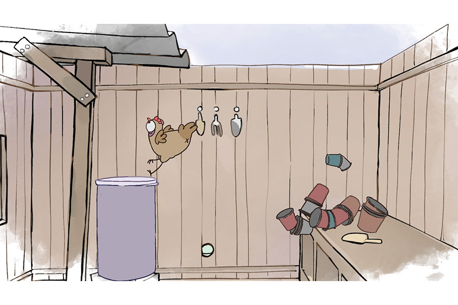 Egy tyúk ráébred, hogy az ól nem biztonságos, miután látja, hogy a gazda elviszi egyik társát. Pánikba esve menekülőutat keres, és bár ügyetlenkedve mindent felforgat, végül sikerül kijutnia. Diadalittasan ünnepel, de öröme rövid életű…